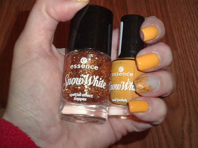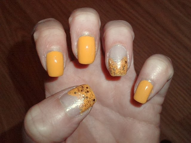 O mr. Happy resulta num tom de amarelo meio a puchar para o mostarda muito bonito enquanto que o huntsman é um glitter dourado com particulas de vários tamanhos e dimensões o que lhe dá um toque original. Combinei estes dois vernizes no anelar e polegar e o resultado final foi este...espero que tenham gostado ;-)